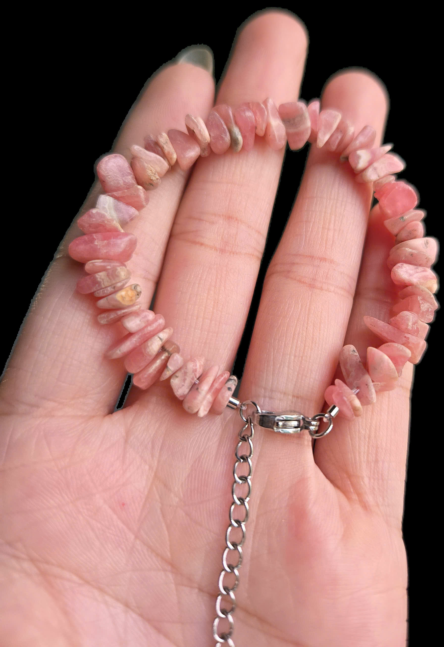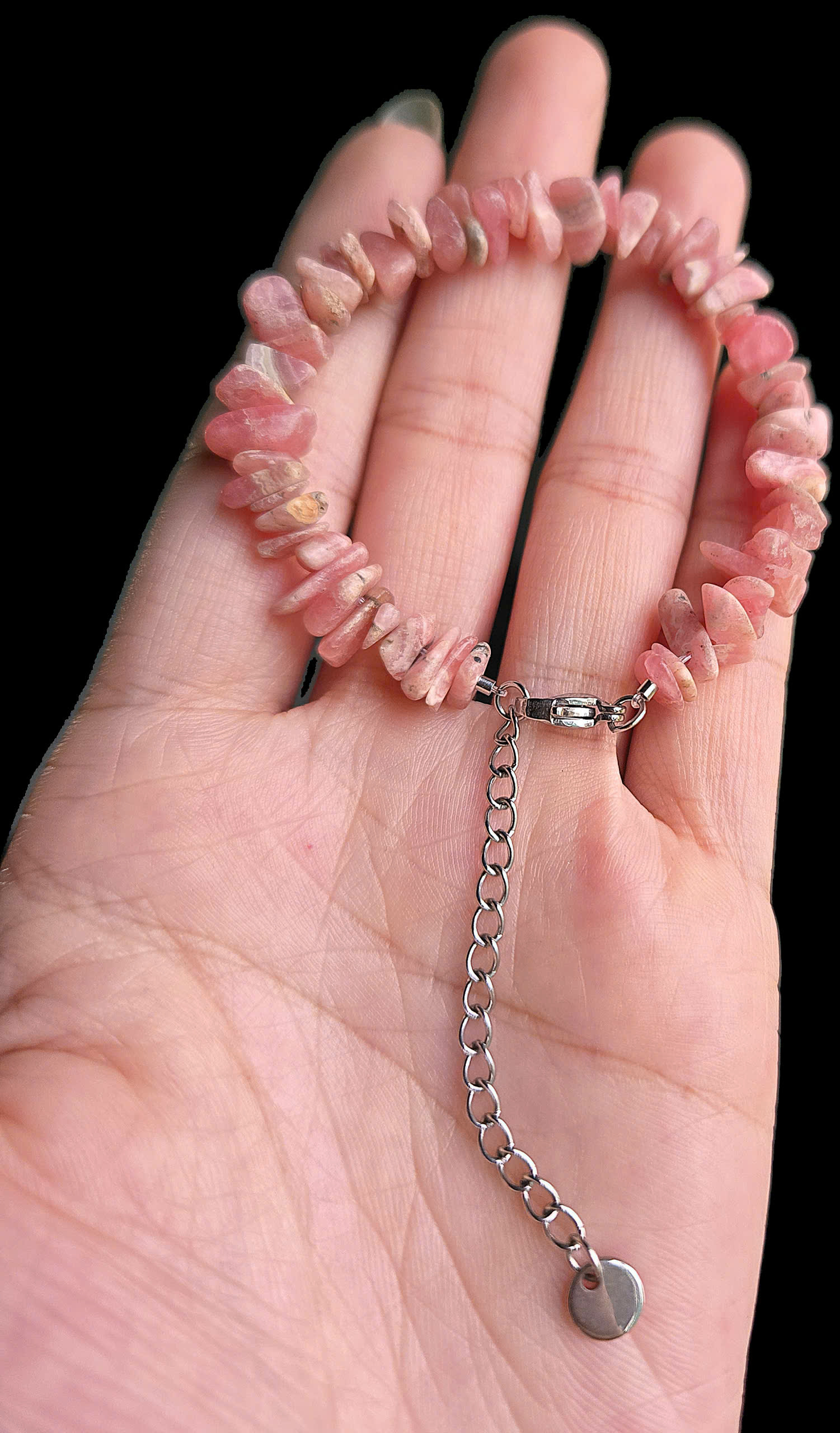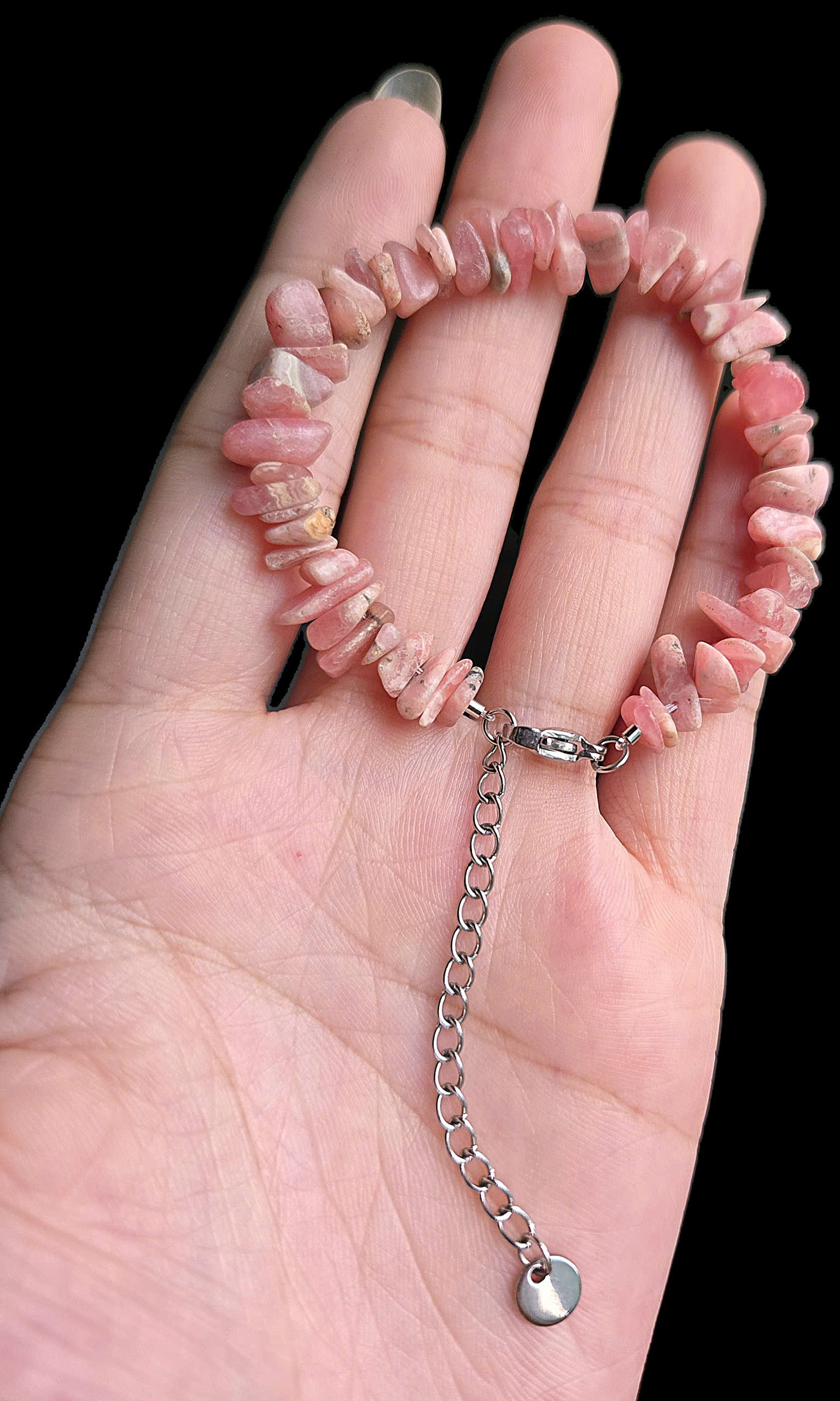 - Vòng tay này được làm từ đá Đào Hoa – Rhodochrosite tự nhiên, mang lại năng lượng tích cực. 💎